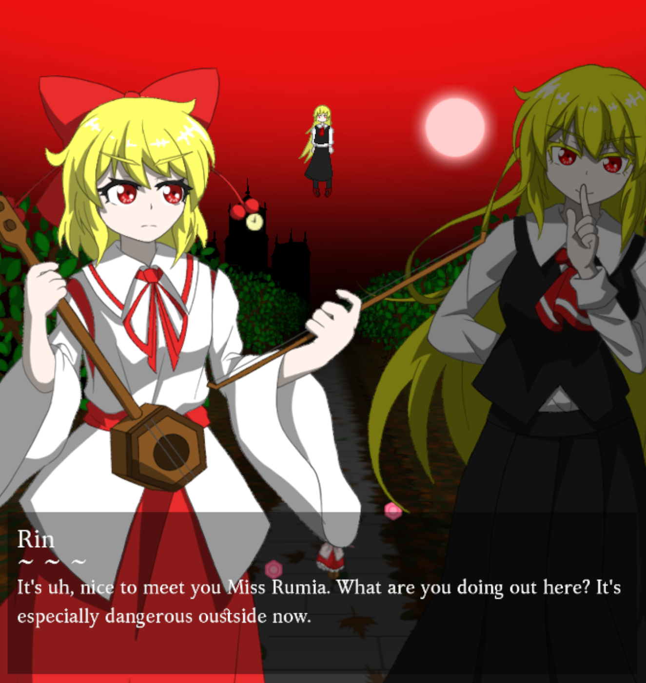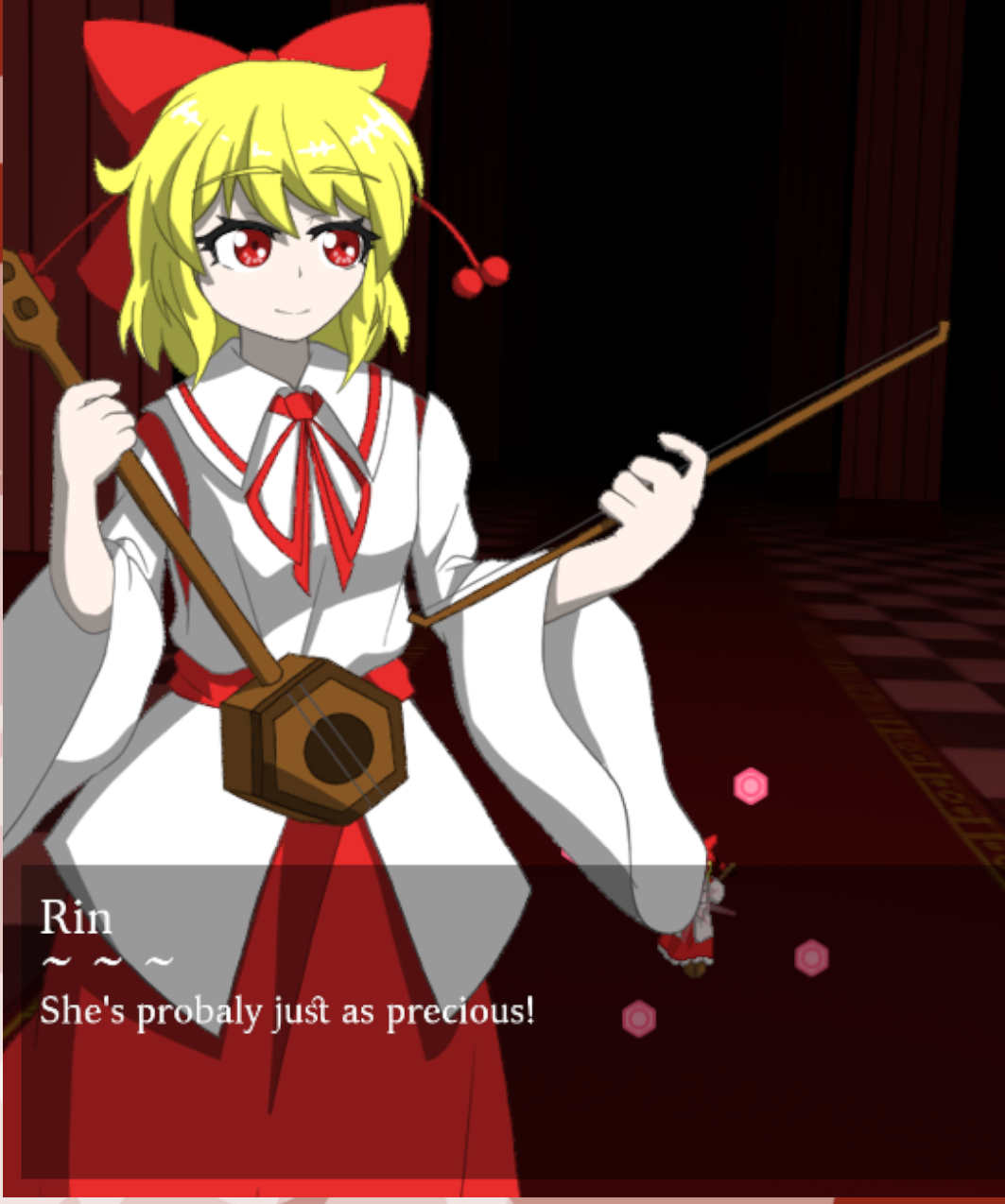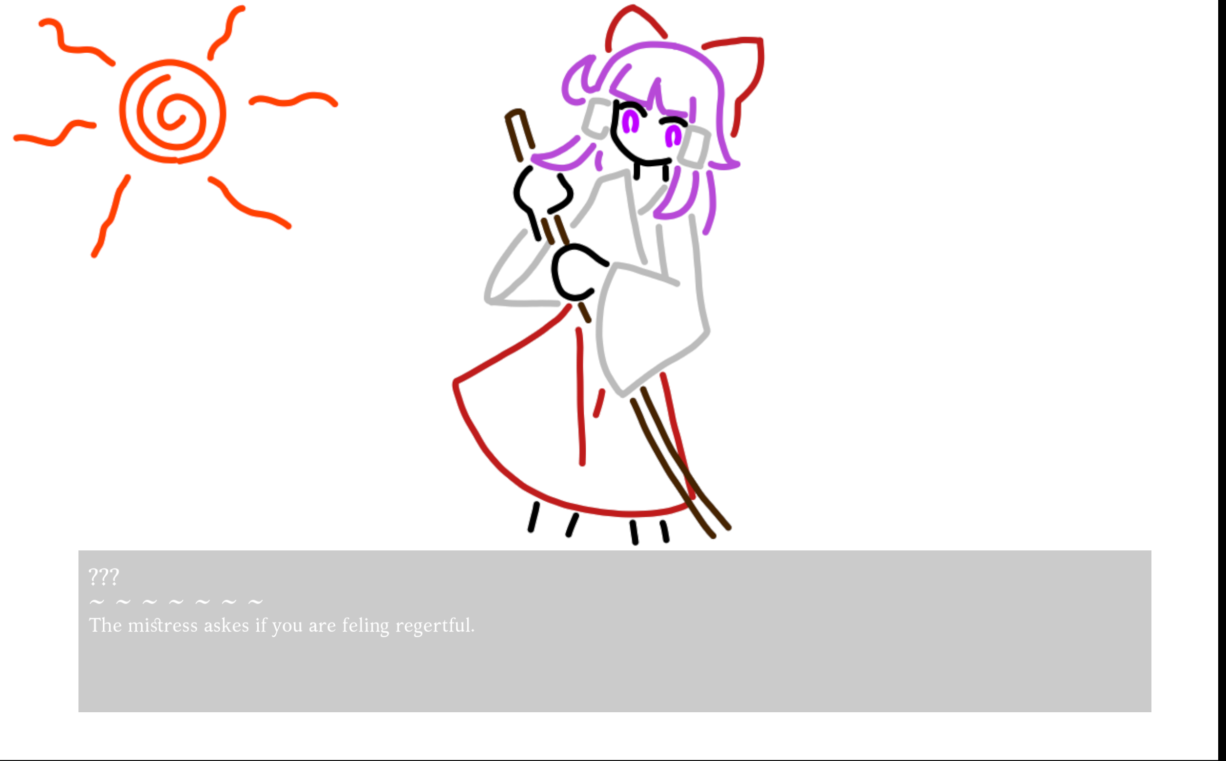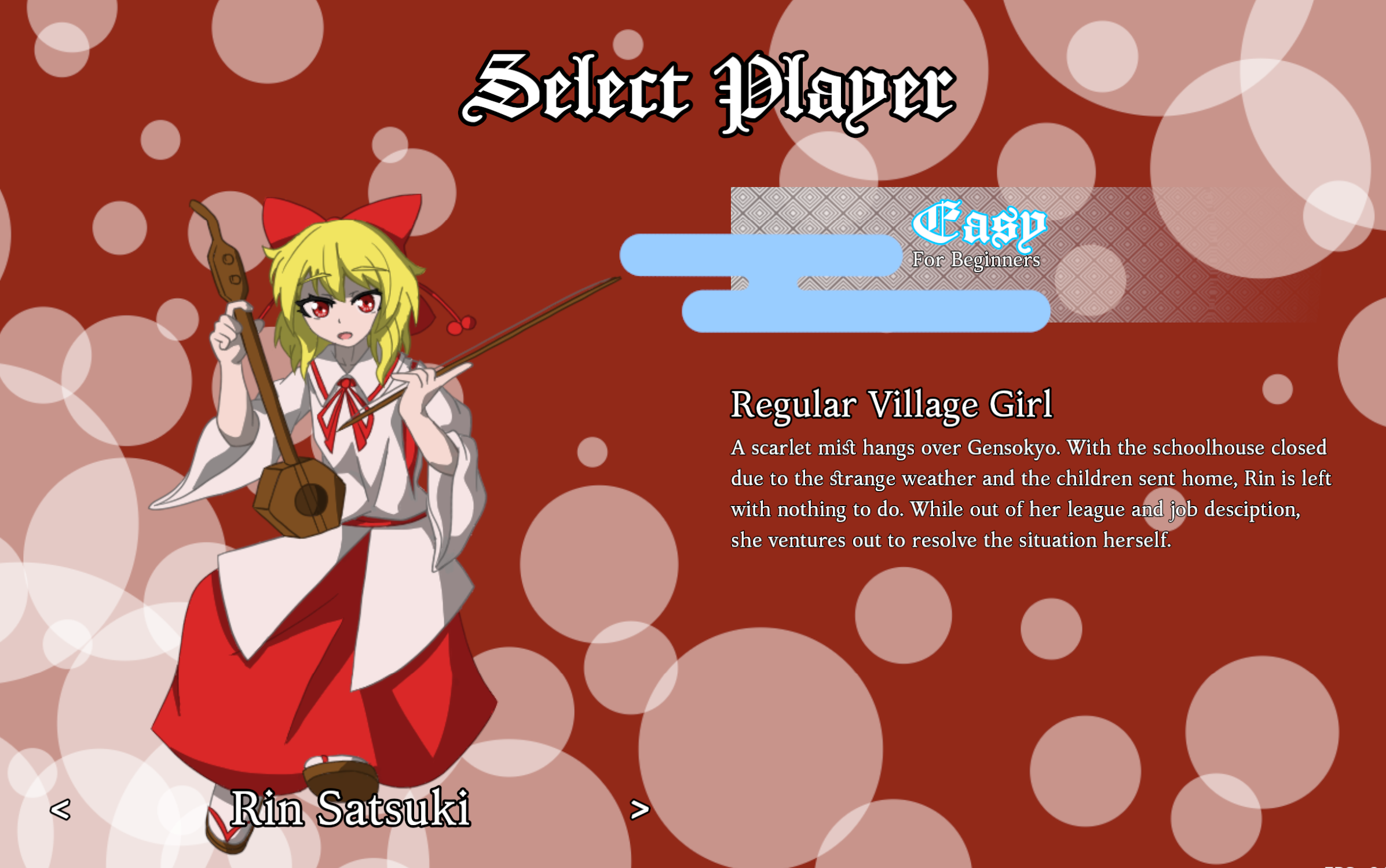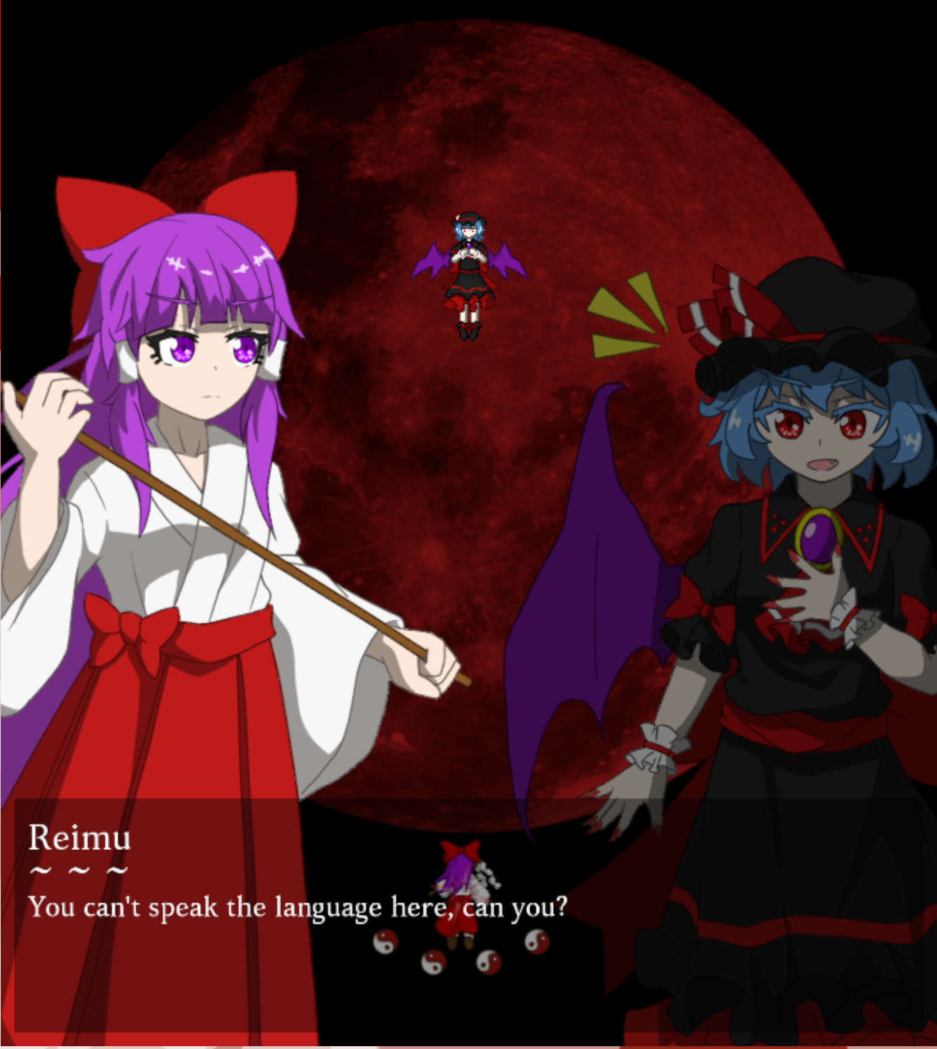 The artwork and dialogue is great. I really love how you incorporated the earlier timeline vibe with the pc98 protag design, differing character artwork, the LW small Remi design to align with the pc98 designs, and it all leads up to her not knowing English, it's a great joke. The mspaint credits art is funny and mirror the Zun sketch credit scenes. Rin being playable is appreciated, and you wrote her as such a sweetheart. Remi herself is also really kind when she can be properly understood. One suggestion regarding the Remi dialogue would be to have her speaking Japanese over the asterisks. Akin to a reversal of what we see going on in English. I don't speak Japanese, but it was a suggestion I saw proposed when I shared screenshots of the game in a discord server by a native speaker of Japanese. That might be a fun additional gag for anyone who spoke it or anyone who went out of their way to try to translate her dialogue mid playthrough.