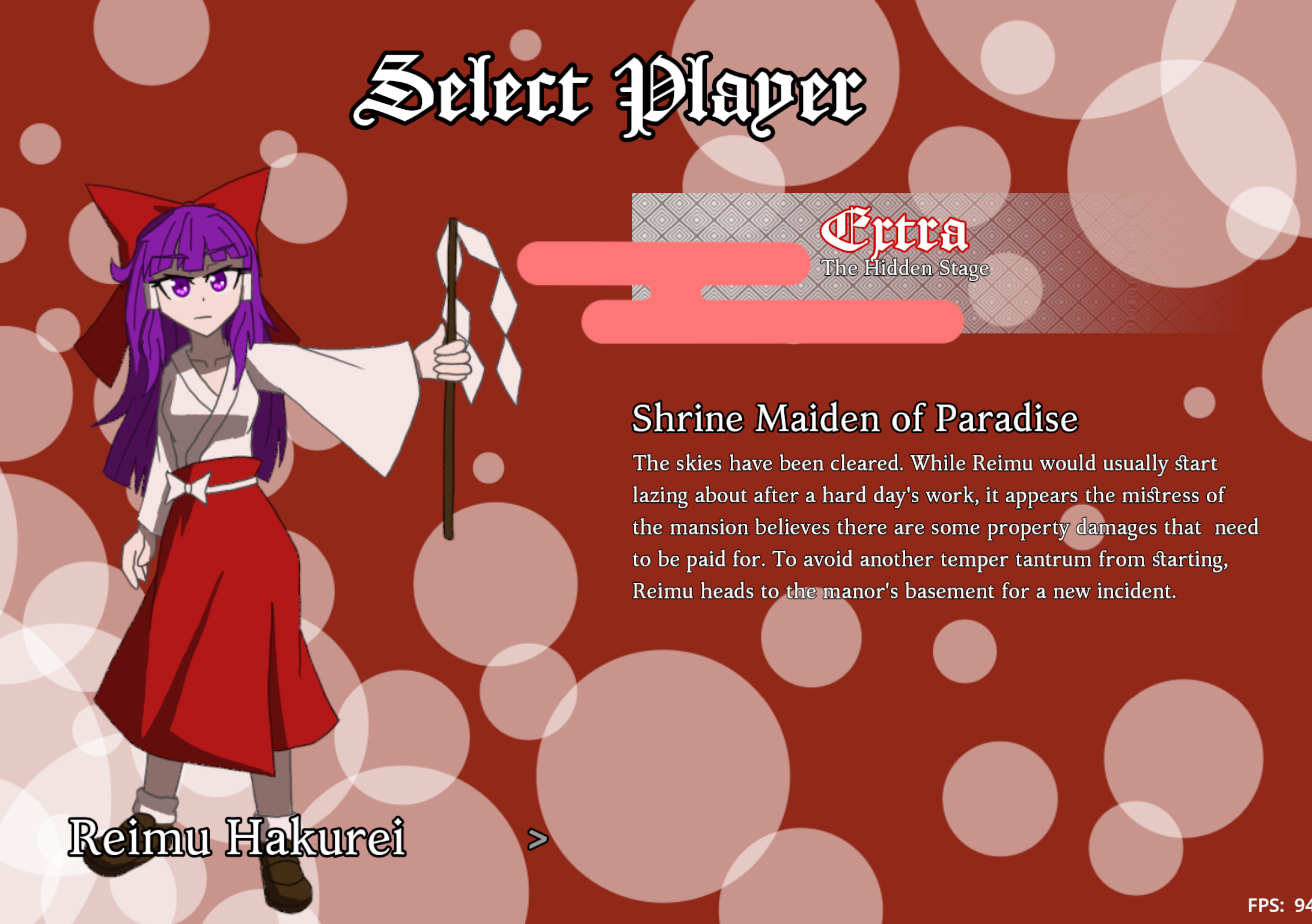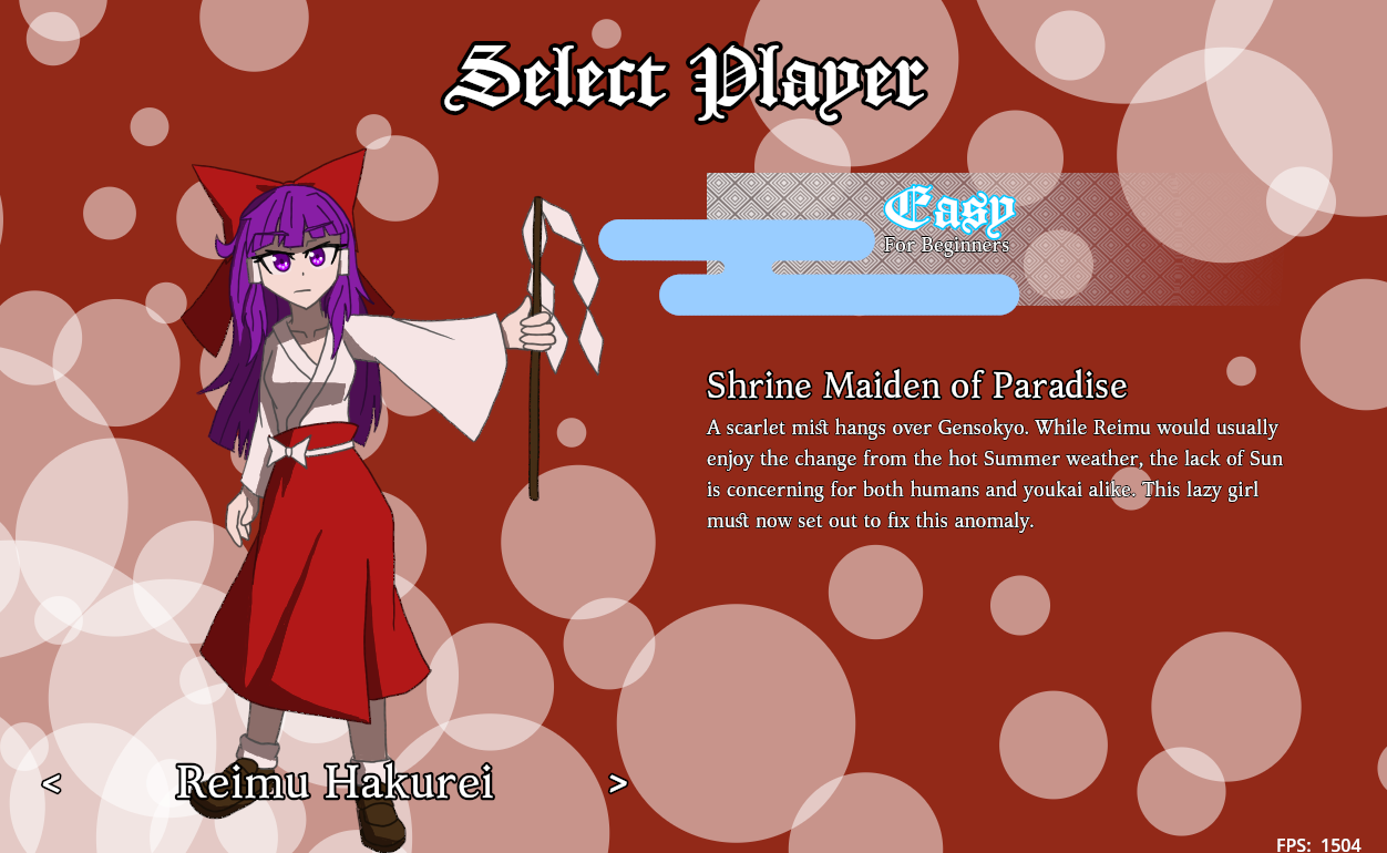 If you had played a different version and have trouble starting up the game, go to the App Data folder ([User Folder] > AppData > Roaming > Godot > app_userdata) and delete the Re_EoSD folder. Then start the game again.